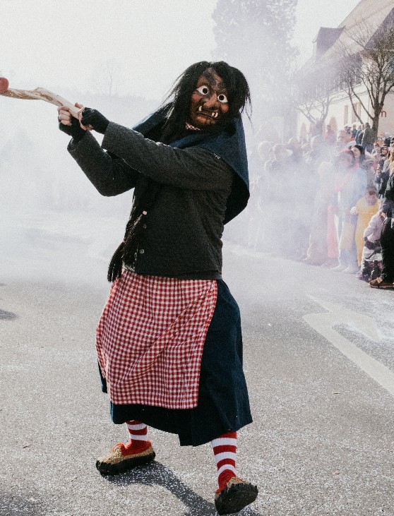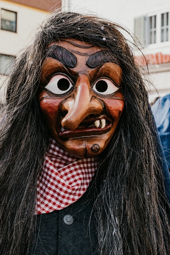 Die Maske wurde mit unserem Schnitzer auf Basis eigener Ideen erstellt. Das Rosshaar haben wir vom Rossmetzger vor Ort besorgt. Das Tuch rundet die Maske passend zum gleichfarbigen Rock ab. Das Gesicht wird durch eine große Nase und einer hochgezogenen Augenbraue verziert.